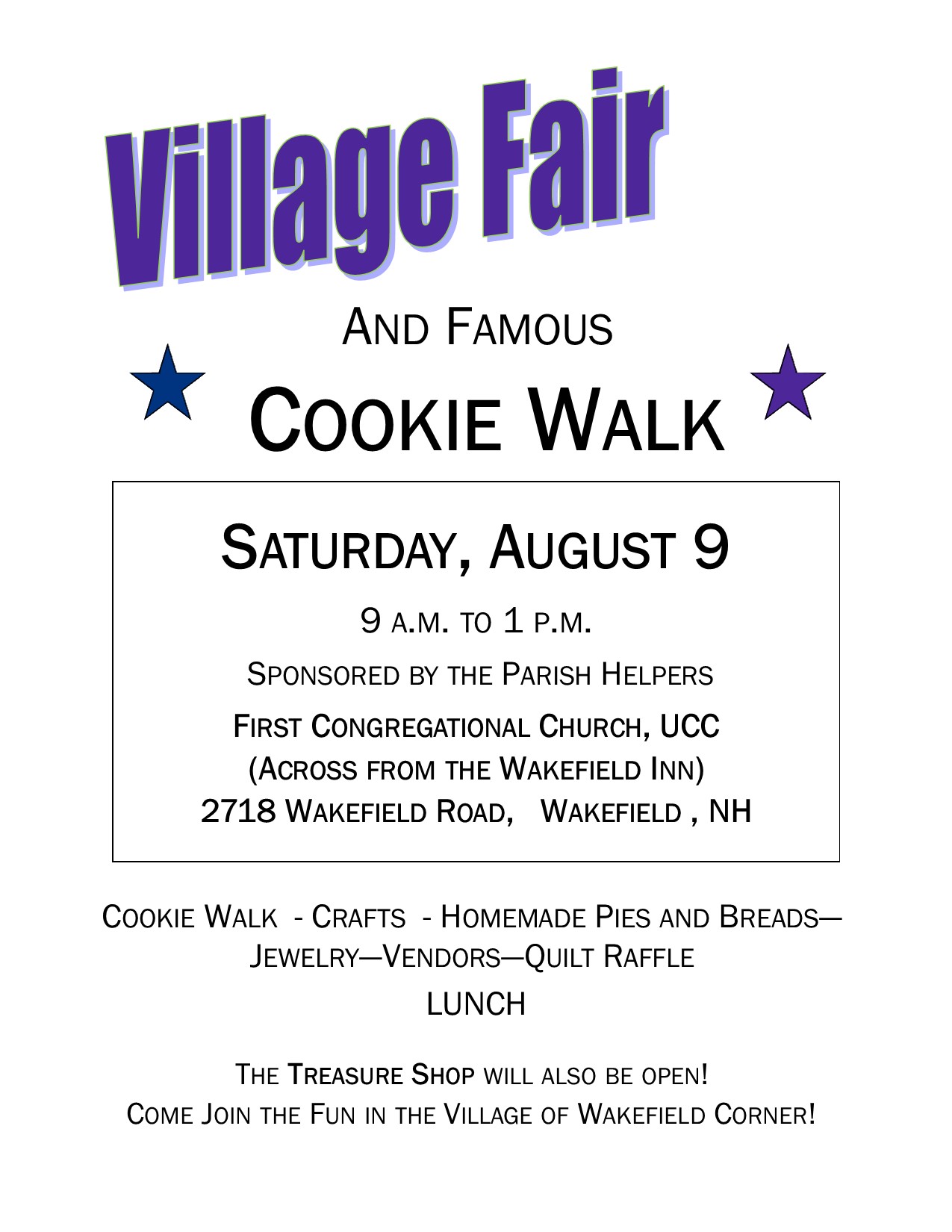 FCCW Wakefield Rd, Sanbornville , NH, United StatesThe Parish Helpers’ Village Fair and Cookie Walk will be held on Saturday, August 9 from 9 a.m. to 1 p.m. at the First Congregational Church of Wakefield NH, United Church of Christ. Come by and enjoy the famous Cookie Walk – choose your own selection from a huge variety of homemade cookies. [...]